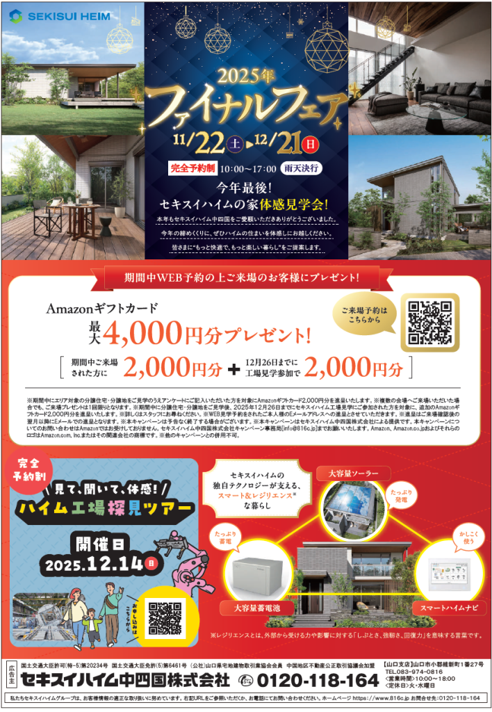 ★ファイナルフェア~12/21(日)まで★ 2025.11.29 Post Share Hatena Pocket RSS feedly Pin it この記事のタイトルとURLをコピーする 期間中Web見学予約の上、ご来場のお客様へ、 Eメールでもらえるギフト券最大4000円分をプレゼント! ご予約は以下のリンクまで! ★ご予約はコチラ★ Post Share Hatena Pocket RSS feedly Pin it この記事のタイトルとURLをコピーする