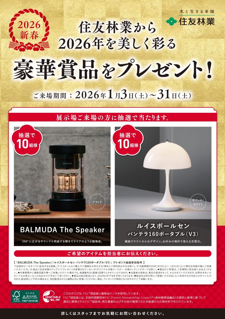 新春来場フェア 2026.01.03 Post Share Hatena Pocket RSS feedly Pin it この記事のタイトルとURLをコピーする 2026年1月3日~31日までに展示場・ショールームにご来場の方に抽選で素敵な豪華賞品をプレゼント中です。この機会にぜひご来場ください。 Post Share Hatena Pocket RSS feedly Pin it この記事のタイトルとURLをコピーする ご入居宅見学会 次の記事